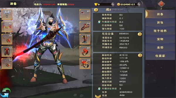 背包(装备):可以查看自身属性