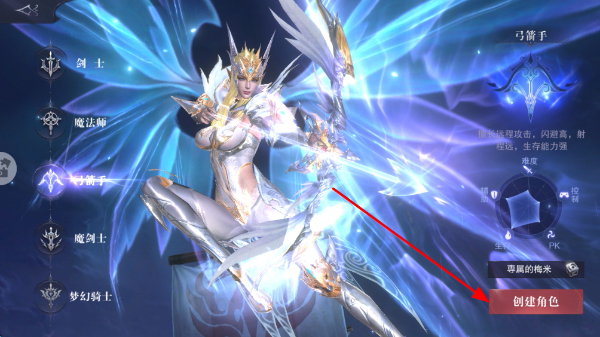 1、在职业选择界面,挑选弓箭手等心仪职业,点击创建角色按钮,生成专属游戏角色。