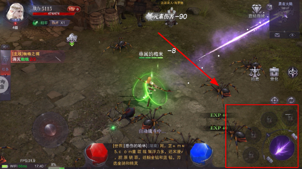3、操控角色前往野外,使用技能攻击蜘蛛怪物,完成消灭蜘蛛的主线任务,获取战斗经验。