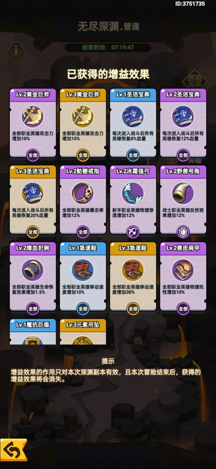 在通关关卡选择增益时,除了要选择等级较高的增益之外,选择全职业增益收益较高,没有全职业增益和圣洁宝典时,优先选择队伍中较多职业的增益效果。
