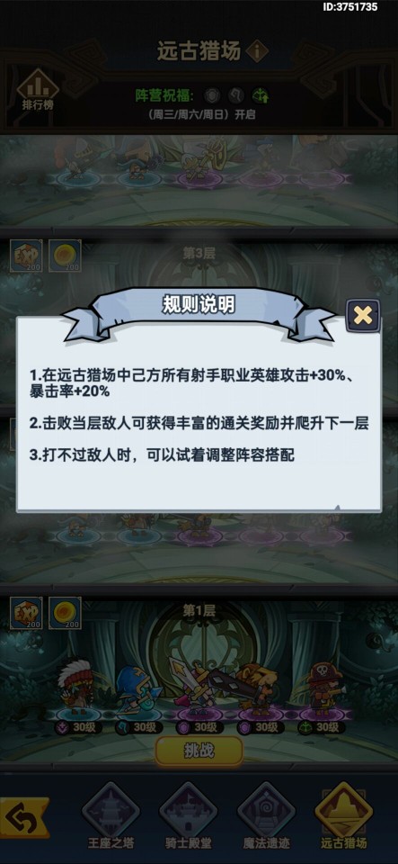 而四种爬塔模式中的王座之塔为常驻模式不做限制,骑士殿堂、魔法遗迹和远古猎场交替开放,每天最多开放一个,每次开放最多可以打二十层。三个限时爬塔玩法,会有一定的增益效果,骑士殿堂增加战士双抗,魔法遗迹增加法师得攻击和攻速,远古猎场增加射手的攻击和暴击率,各位冒险者可以在限时爬塔中,根据增益效果调整自己的阵容。