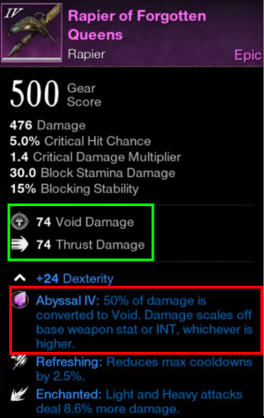 重点是后面一句Damage sacles off base weapon stat or INT,whichever is higher,意思是这把武器现在会基于原本的武器加成属性((对刺剑来说就是敏捷或力量)或者智力来决定最终伤害,取两者之间更高的一项。